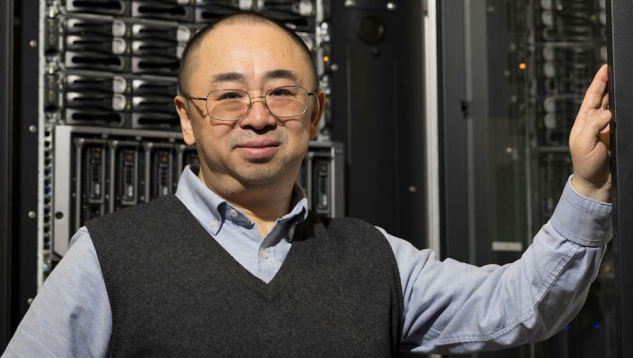 Yu Chen, a faculty member in the Department of Electrical and Computer Engineering at the Thomas J. Watson College of Engineering and Applied Science, in the Data Center of the Engineering and Science Building at Binghamton University’s Innovative Technologies Complex. Image courtesy of Jonathan Cohen.