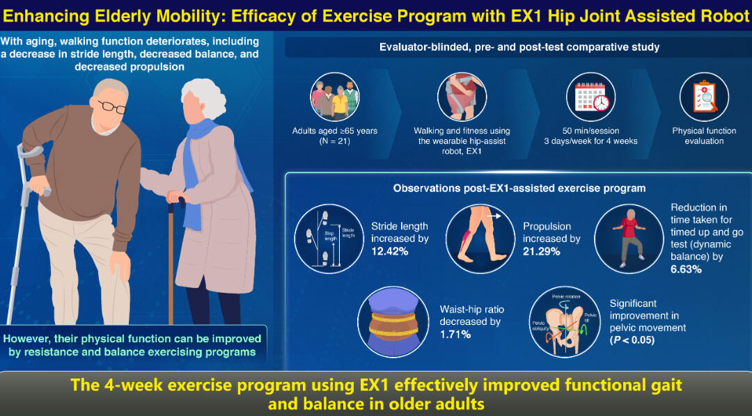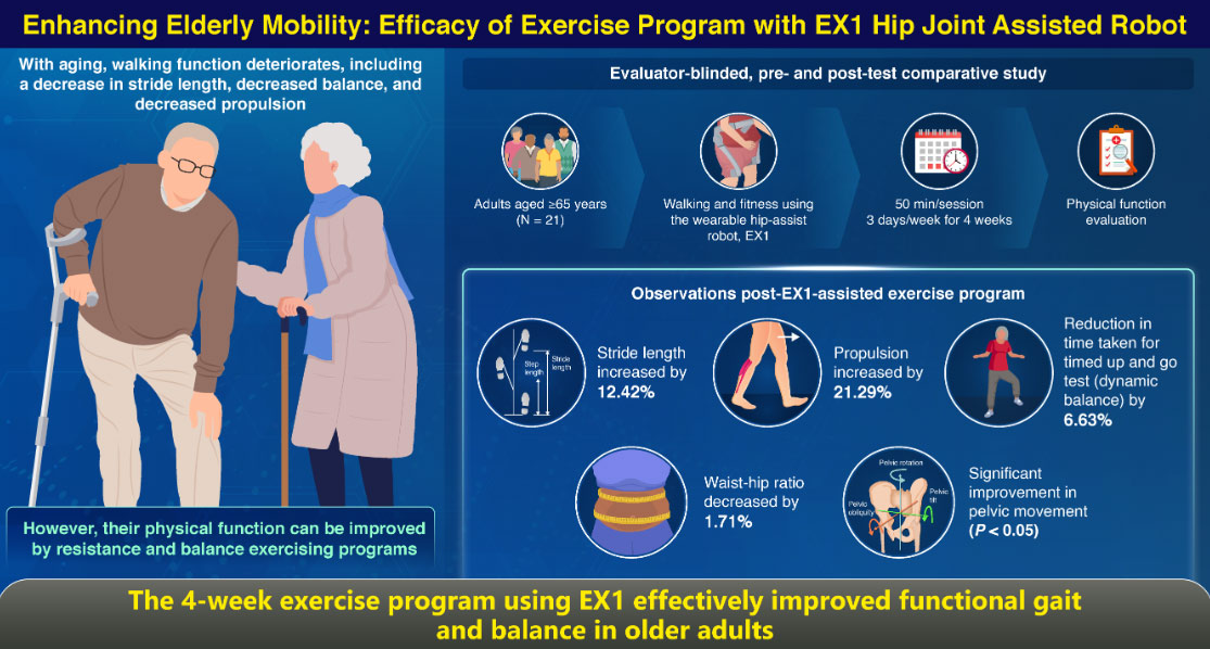 Led by Professor Wan-hee Lee from Sahmyook University College of Health Science, Korea, a collaborative team of researchers, Noble County, and Samsung Electronics, assessed the effectiveness of EX1 in executing a 4-week combined exercise program for older adults. Twenty-one adults age 65 years or above performed a supervised exercise program consisting of walking, and strength and balance exercises, wearing EX1 for 50 minutes per session, 3 times a week for 4 weeks. To compare pre- and post-exercise attributes, the spatiotemporal parameters and pelvic movement were analyzed by G-Walk. Additionally, functional outcomes were evaluated by the Timed Up and Go (TUG) test, muscle power by rehabilitative ultrasound imaging, and waist-hip ratio. Following the exercise regimen, significant improvements were noted in various spatiotemporal factors: stride length increased by 12.42%, whereas propulsion increased by 21.29%, suggesting improved walking ability. The TUG test revealed a 6.63% decrease in completion time, indicating improved dynamic balance and expanded movement range among participants. Additionally, there was a 1.71% reduction in the waist-hip ratio.