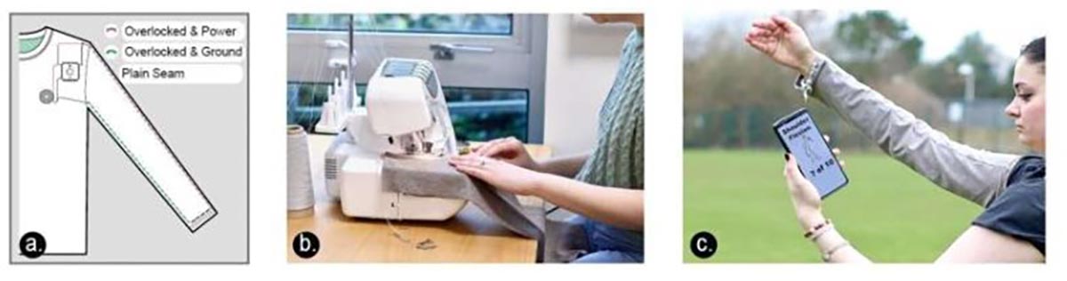 SeamSleeve is a novel sensing mechanism that uses powered seams as sensing channels, retaining traditional fabric design benefits for comfortable and robust motion capture. (a) The researchers empirically evaluate and compare different designs to determine the optimal placement of seams and sensing channels; (b) they demonstrate that their approach can effectively train and classify arm movements; (c) they propose SeamSleeve for rehabilitation exercises beyond the clinic. Image courtesy of Olivia Ruston.