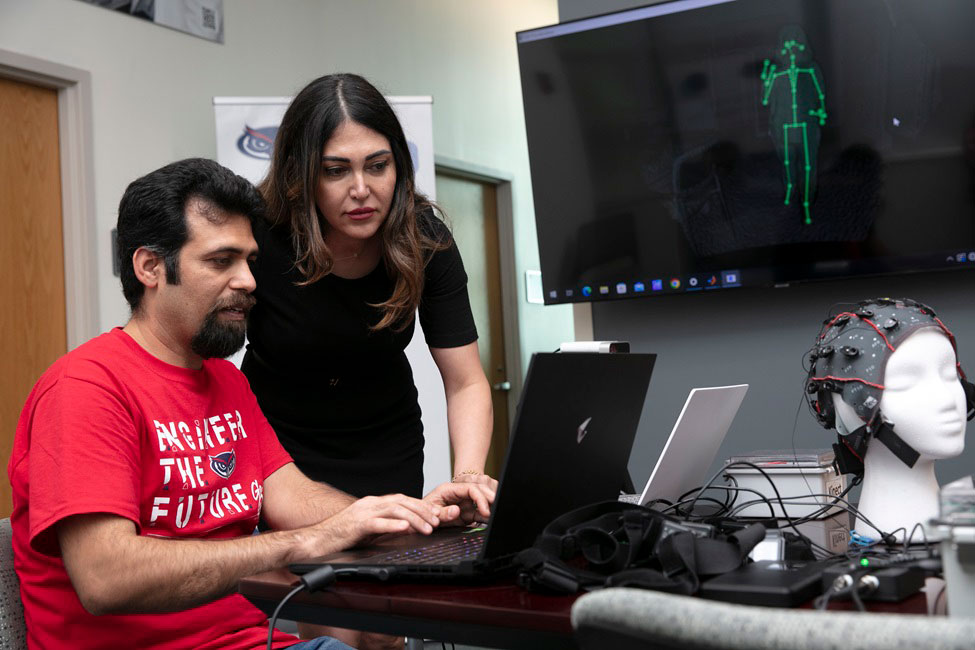 Mahmoud Seifallahi (seated) and Ghoraani review the performance of straight walking using a depth camera, which can detect and track 25 joints of body movement. Image courtesy of FAU College of Engineering and Computer Science.
