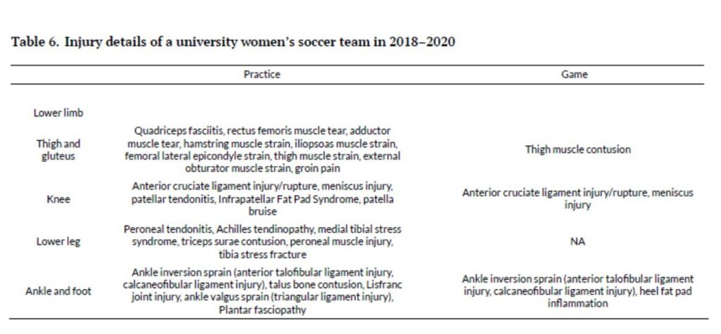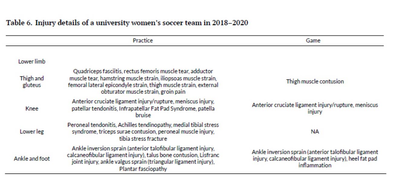 Sport Sciences researchers from Waseda University in Japan sought understand injuries in female university soccer players. Their prospective study investigating injuries in this population over 3 seasons was recently published in the International Journal of Sports Physical Therapy. They found the overall injury rate was 1.62/1000 athlete exposures and the game injury rate (9.86/1000 athlete exposures) – much higher than the practice injury rate (1.39/1000 athlete exposures). Sprains were the most common injury in games and practices; concussions and meniscal tears were also common during games. The lower limbs, particularly the ankles and feet, were the most common anatomical injury sites in both games and practices. Severe injuries requiring long-term withdrawal were frequently observed during games and practices. These included anterior cruciate ligament (ACL) tears, meniscal injuries, and severe concussions, all of which necessitated prolonged recovery periods and withdrawal from team activities. The table details specific injuries for the lower limb.