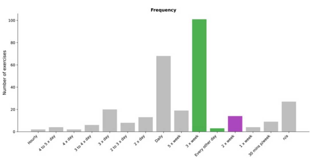Figure 1. Frequency to perform individual prescribed exercises. Gray color indicates not meeting recommendations, green for meeting novice lifters, and purple for intermediate to advanced.