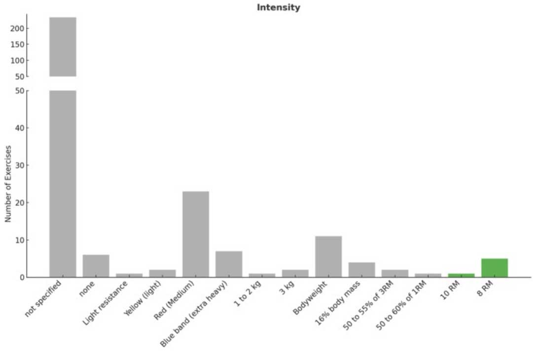 Figure 2. Load intensity of individual prescribed exercises. Gray color indicates not meeting recommendations, green for meeting novice lifters, and purple for intermediate to advanced.