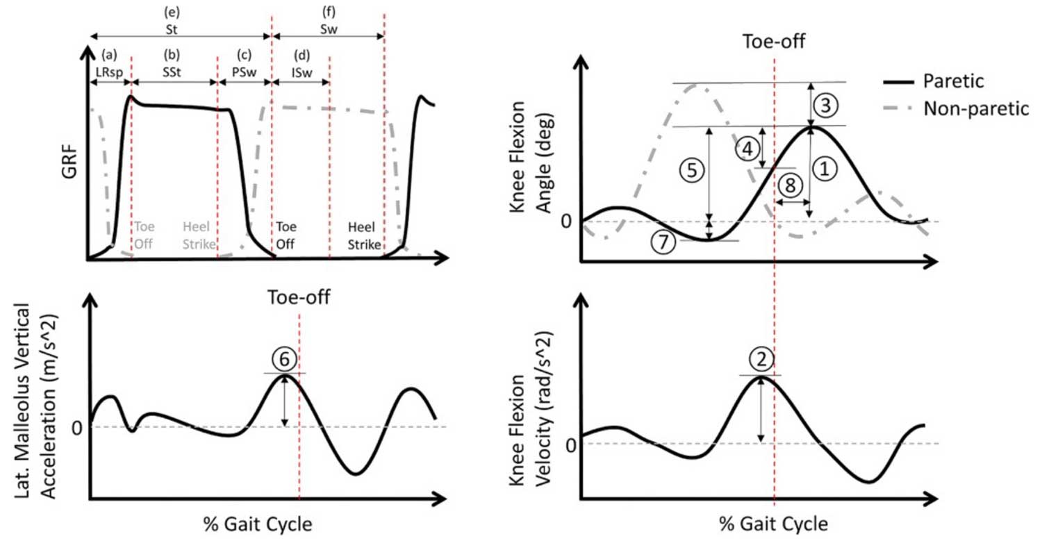 Figure. Gait phases and features associated with post-stroke SKGs. Gait phases (top left) are divided into a) Loading response (LRsp), b) Single-limb support stance (SSt), c) Pre-swing (PSw), d) Initial Swing–50 % of swing, (ISw), e) Stance (St), and f) Swing (Sw). Gait features from paretic side relevant to post-stroke SKG are 1) peak knee flexion in swing, 2) peak knee flexion velocity in pre-swing, 3) between-limb difference of peak knee flexion in swing), 4) knee range of motion in initial swing, 5) knee range of motion in full cycle, 6) peak push off acceleration in pre-swing, 7) timing of peak knee flexion in swing, and 8) peak knee extension in stance.