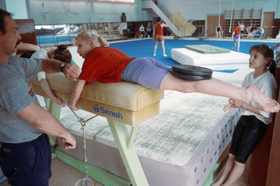 Too much training? Members of the Soviet women’s gymnastics team training in 1991 in Moscow.