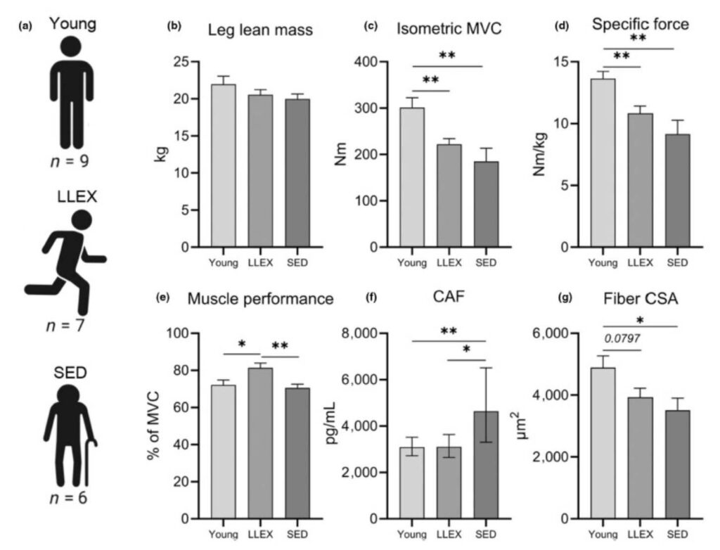 Figure. Sedentary aging is associated with reduced muscle performance and neuromuscular disturbance in vivo. (a) In vivo characterization of male participants. (b) Leg lean mass, measured by DEXA. (c) Isometric unilateral knee extension MVC, measured in a dynamometer. (d) Specific force, calculated as MVC per leg lean mass. (e) Muscle performance, measured as force exerted during repeated maximal knee extension concentric contractions, expressed relative to MVC. (f) CAF, measured in plasma by ELISA. Statistical analysis was conducted on log transformed values. (g) Muscle fiber cross sectional area measured using immunohistochemical analyses of muscle biopsy cross-sections. All data are means ± SEM except CAF which is shown as geometric means with 95% CI. N: LLEX: 7, SED: 6, Young: 9. Statistics: Data were analyzed by unpaired two-tailed t-tests, with significance indicated by *P < 0.05, ** P < 0.01, *** P < 0.001. CAF, C-terminal Agrin Fragment; DEXA, dual-energy X-ray absorptiometry; LLEX, life-long exercisers; MVC, maximal voluntary contraction; SED, old sedentary.