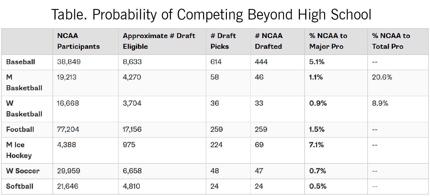 Lastly, much of the push to specialize is driven by money. Youth sports is a $20 million yearly business. Club and travel sports teams are often year round at expensive facilities and camps. The priority for many of these facilities is staying open, not necessarily your athlete’s future. Sadly, sports parents too often have stars in their eyes thinking of scholarships…or even the pros – what are those odds (Table, page 12)? Well, for football, the chances of going pro are slim. According to TeamSnap, it’s something only 1% of the top 1% can achieve.2