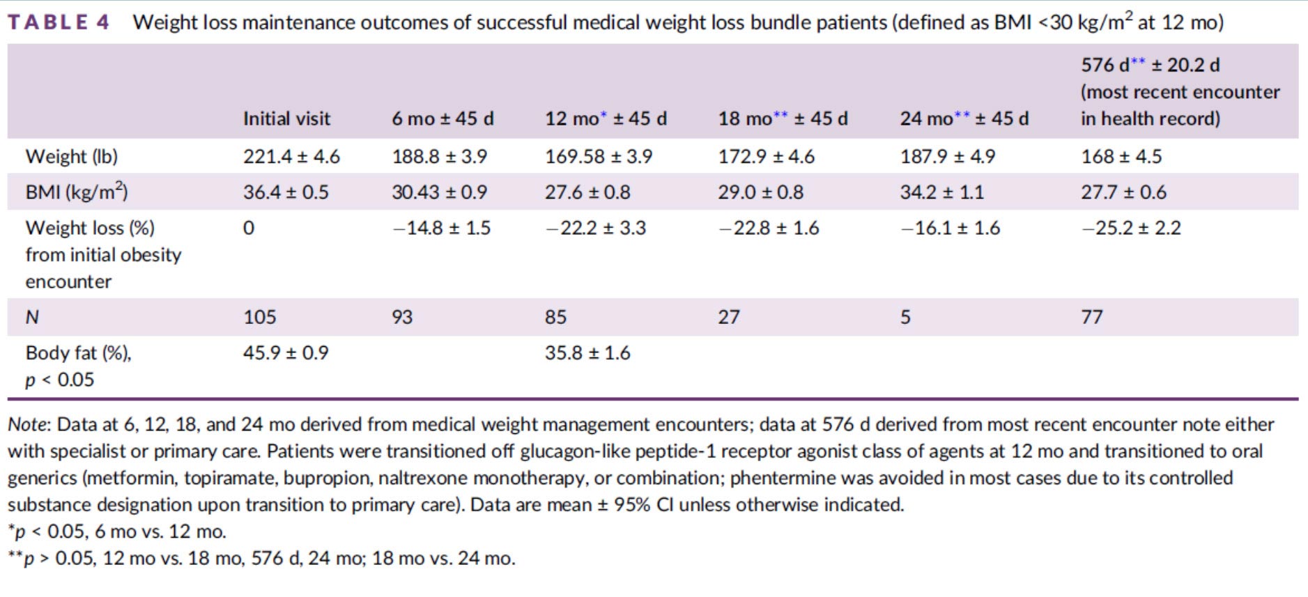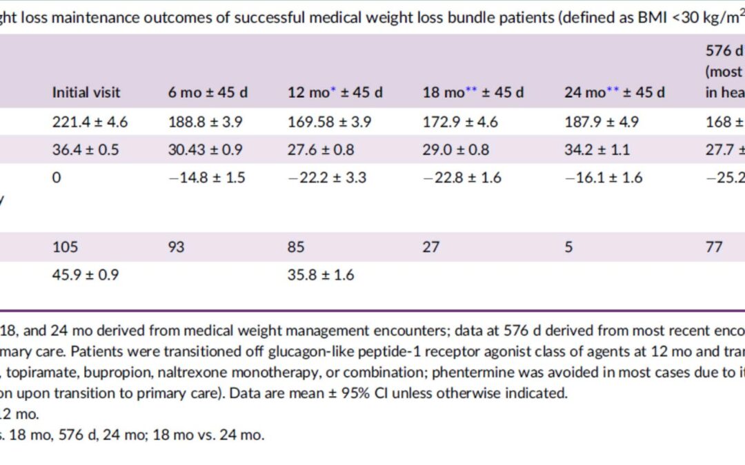 Researchers from Vanderbilt University in Nashville, Tennessee, prospectively followed patients (N = 105) who had completed 12 months of therapy and were part of a “medical weight loss bundle,” which included 12 months of GLP-1 RA therapy followed by 6 months of transition care. The baseline mean BMI was 36.4 kg/m2. Body weight outcomes were measured at 6, 12, 18, and 24 months.