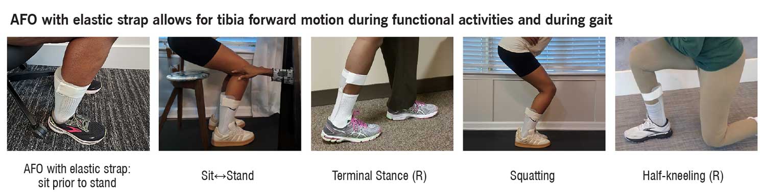 I have a suggestion for physical therapy practitioners who analyze daily activities and provide therapeutic interventions to achieve energy efficient and effective movement strategies for daily living skills. Simply, loosen the restrictive traditional AFO VELCRO® strap at the proximal tibia and or ankle joint or replace it with the appropriate tension of VELSTRETCH® that accommodates the muscle strength present. More elasticity for stronger muscles with isolated movement and less elasticity for muscles that cannot generate enough force to move segments of the lower extremity. Then proceed to practice gait on a variety of surfaces, sitstand, squatting, stair negotiation step over step, and getting up and down from the floor as these functional activities require tibial movement forward and backward and the elastic tension strap allows for that movement. Create therapeutic exercises and or break down activities into component parts in which tibial movement occurs via concentric, eccentric and or isometric muscle activity as it pertains to specific segments of gait during stance and swing phase and those other functional activities. The exercise program should entail a flexibility component open and closed chain and the exercises should vary in type (weight bearing and non-weight bearing) and order (isometric, concentric and eccentric muscle contractions) as well as reflect the individual’s social determinants of health.9-10 Also, include neuromuscular retraining and an aerobic component of different intensities.9-10 For example, the exercises and physical activities for a mother with a newborn who wants to safely push the stroller without falling should be distinctly different for the retired elderly male who wants to return to golf with his caddy and walk 6 holes of the 12-hole course.