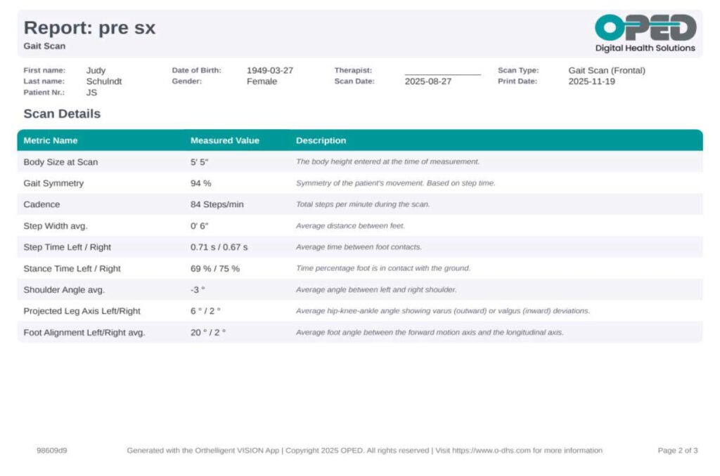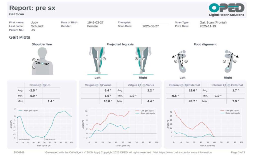 The VISION Gait Analysis application’s objective data from the coronal view highlighted several asymmetries and deviations in JS’s gait pattern. Specifically, the analysis reported differences in stance time between the left and right sides, indicating that JS spends less time on her left leg during ambulation. Additionally, discrepancies in leg axis and foot alignment were observed, reflecting further biomechanical challenges.