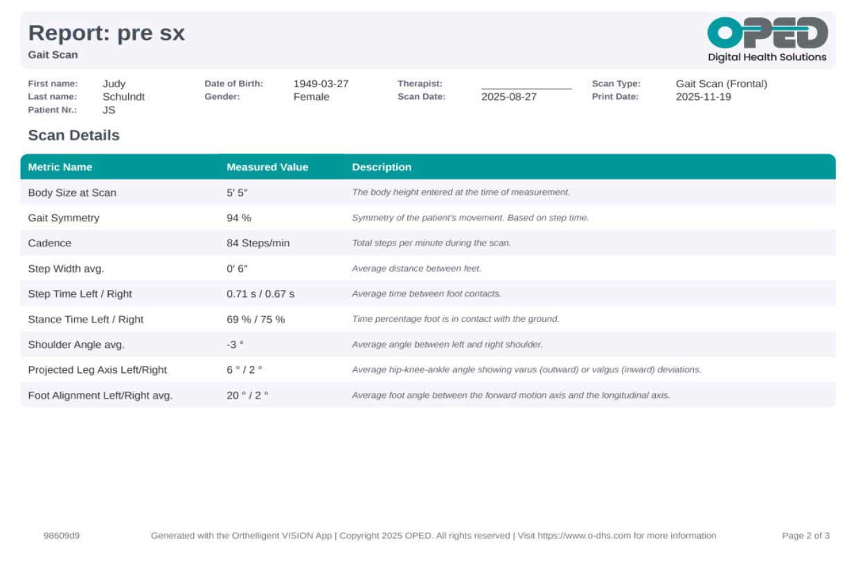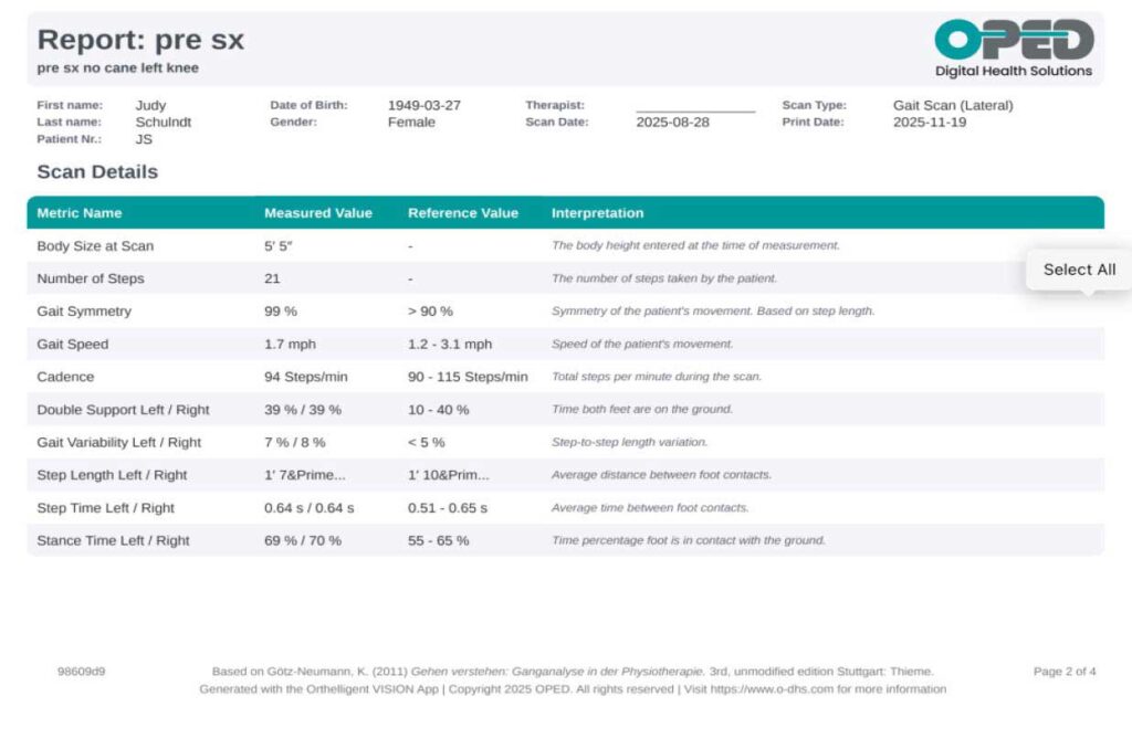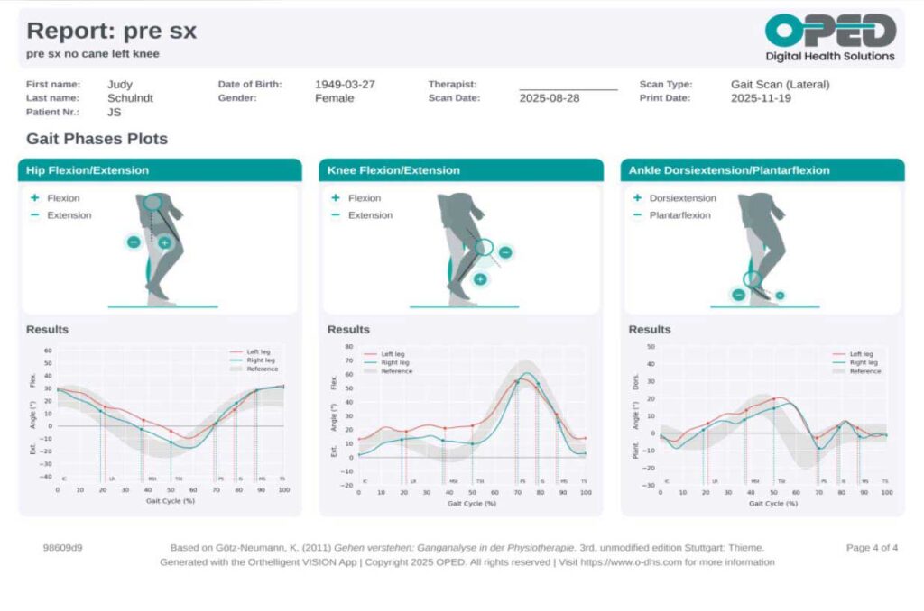 To further evaluate JS’s gait abnormalities and knee instability, the Orthelligent® VISION Gait Analysis application2 by OPED was utilized. This advanced assessment tool was used to analyze her walking patterns in detail. The objective reports generated by the application provided comprehensive temporal-spatial data, such as walking speed and time spent in various phases of the gait cycle, as well as joint angle data for a precise understanding of her movement deviations. These quantitative insights complemented the visual and subjective assessments, offering a thorough overview of JS’s gait characteristics and informing subsequent intervention strategies.