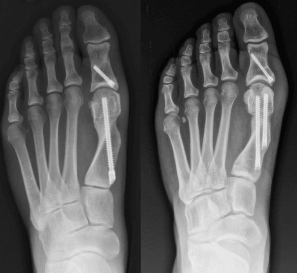 Radiographs demonstrating single-screw (left) and dual-screw (right) fixation following minimally invasive distal metatarsal osteotomy for hallux valgus correction.