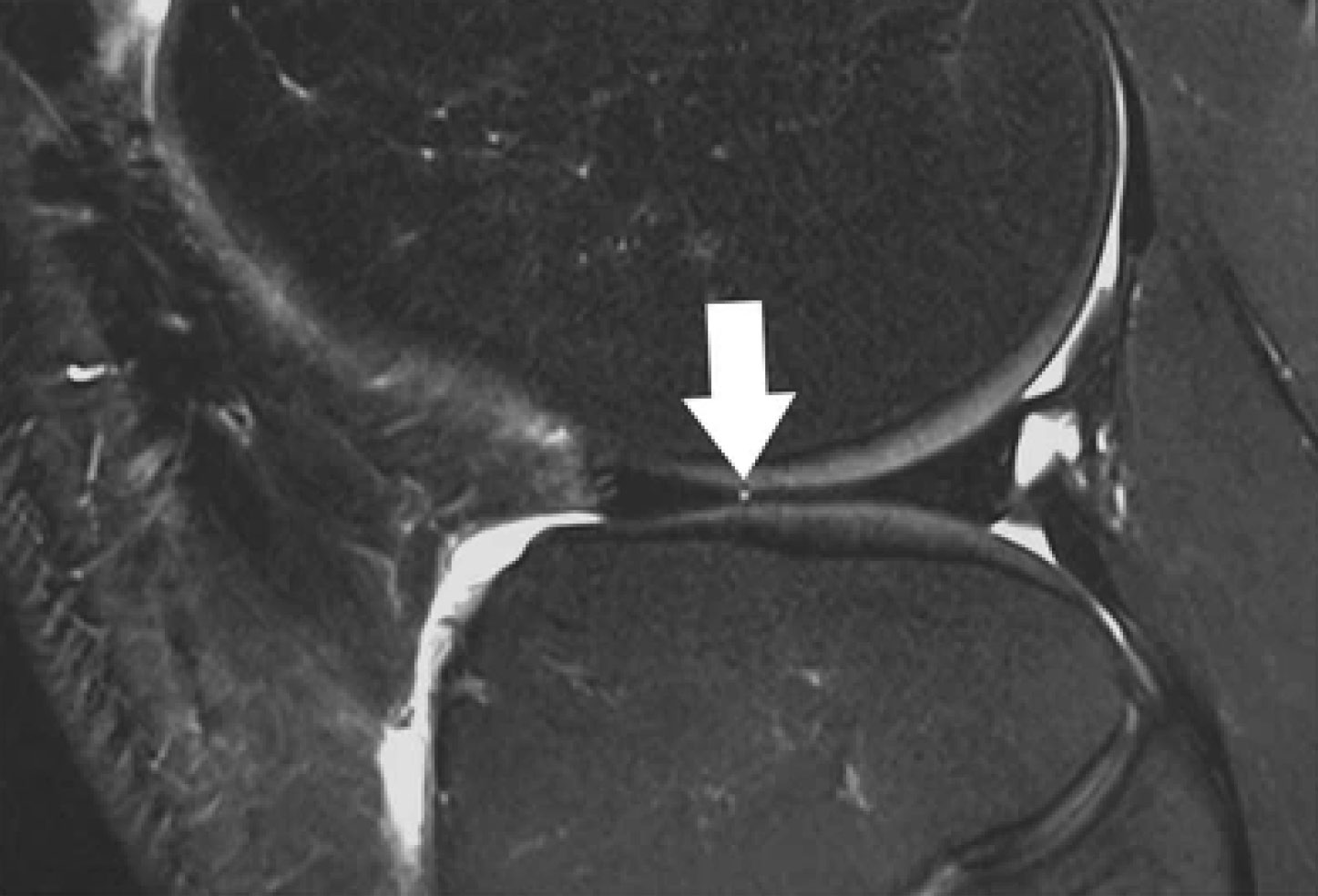 Sagittal T2-weighted, fat-suppressed fast spin echo image of the right knee in a 39-year-old male patient acquired at 3 Tesla (Siemens Healthcare, Erlangen, Germany) using a dedicated 28 channel transmit-receive knee coil shows a small radial tear of the lateral meniscus (arrow). Reprinted from Bolog NV, Andreisek G. Reporting knee meniscal tears: technical aspects, typical pitfalls and how to avoid them. Insights Imaging 2016;7:385–398. https://doi.org/10.1007/s13244-016-0472-y. Use is per Creative Commons Attribution 4.0 International License.