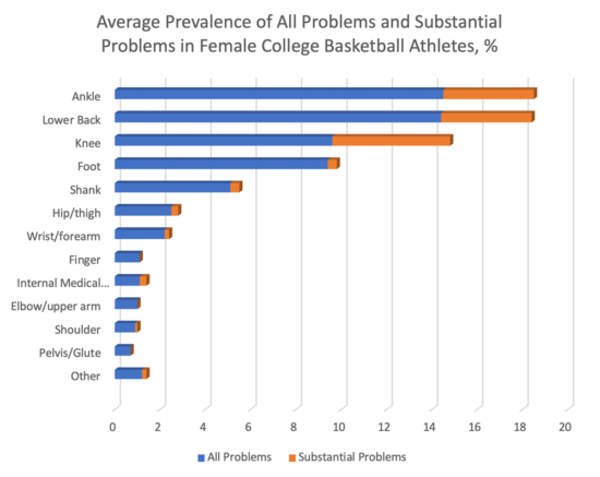 In a study out of Japan, 54 female college basketball athletes filled out the Oslo Sports Trauma Research Centre questionnaire detailing all “physical complaints” for 135 days. The average daily prevalence for any problem was 44%, with substantial problems accounting for 16%. The area most affected by physical problems was the ankle (14.5%), followed closely by the lower back (14.4%), and then the knee (9.6%). The knee also accounted for the largest proportion of substantial problems at 5.2%, compared to 4% for both the ankle and lower back. These 3 anatomical areas also accounted for the highest severity scores at 606 for ankle (ankle sprain most common), 600 for knee (ACL injury and return to full performance issues), and 561 for lower back (mostly overuse).