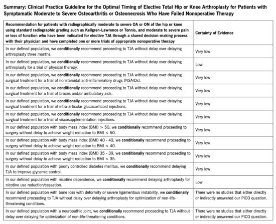 Key among the take-home messages was that the decision of when to proceed with TJA should be made through a shared decision-making process between the physician and patient during which the unique risks and benefits for the individual patient are considered (guiding principle).