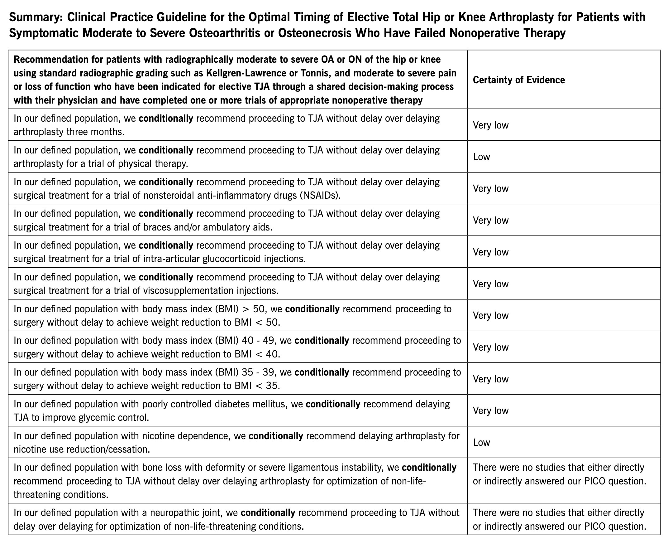 This summary was approved by the ACR Board of Directors on February 22. 2023, and the AAHKS Board of Directors on March 8, 2023. These recommendations are included in a full manuscript, which will be submitted for publication in Arthritis & Rheumatology, Arthritis Care and Research, and the Journal of Arthroplasty. *All recommendations are conditional, largely due to the quality of the evidence.