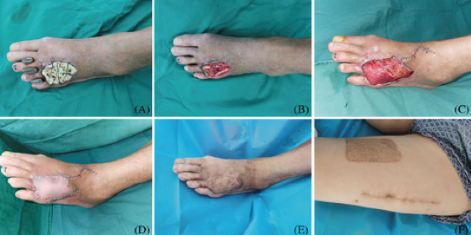 Case Study: A 54-year-old male had diabetes and dorsum DFU on the left foot. (A) After stage I debridement, the wound was covered with bone cement. (B) During stage II, after ALBC’s removal and tendon exposure, the formation of an ‘induction membrane’ could be seen. (C) A free VLMS flap was used to cover the wound. (D) The thigh STSG was used to cover the muscle. (E) At the 12-month postoperative follow-up, the flap showed a full and soft appearance. (F) The donor site scar was minor and easily concealed.
