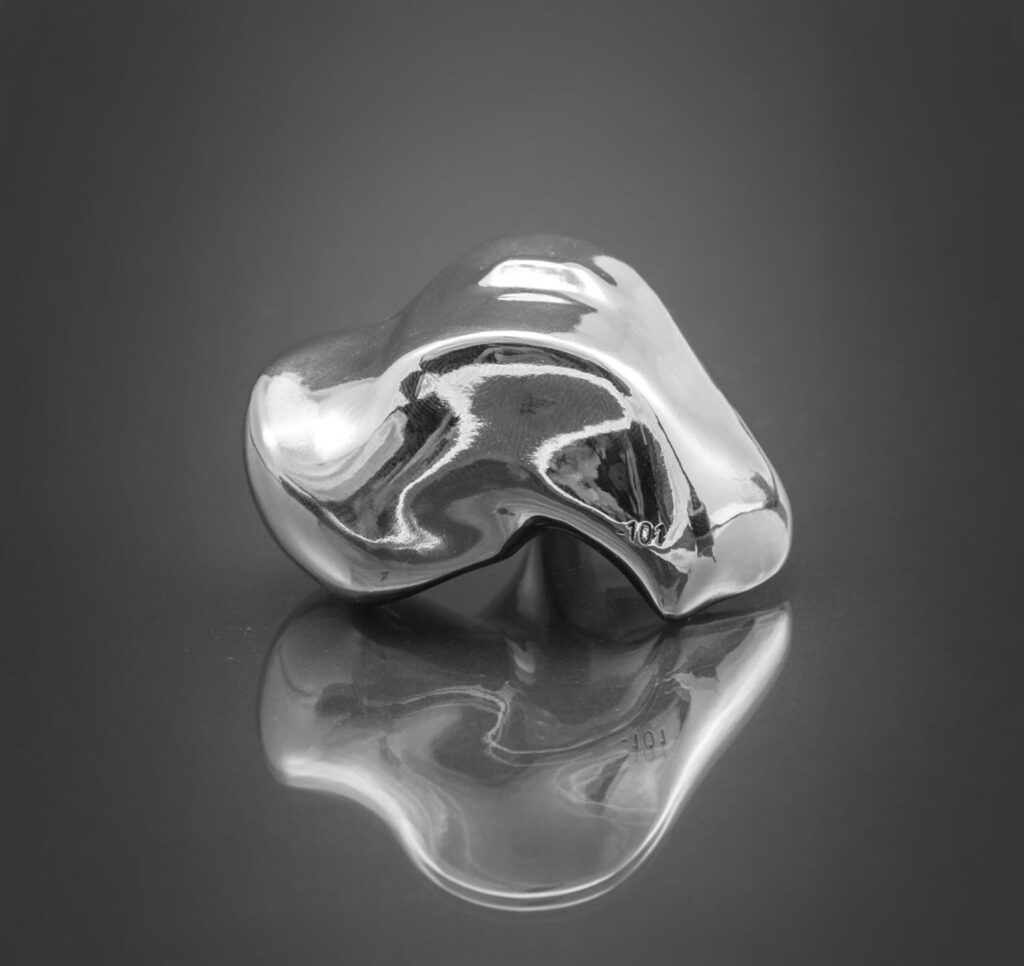 A close-up of a 3D-printed cobalt chrome talus bone implant printed by Restor3D. The company, spun out of Duke University in 2017, specializes in custom implants used for trauma and oncology cases, and off-the-shelf 3D-printed implants that have been cleared by the FDA.