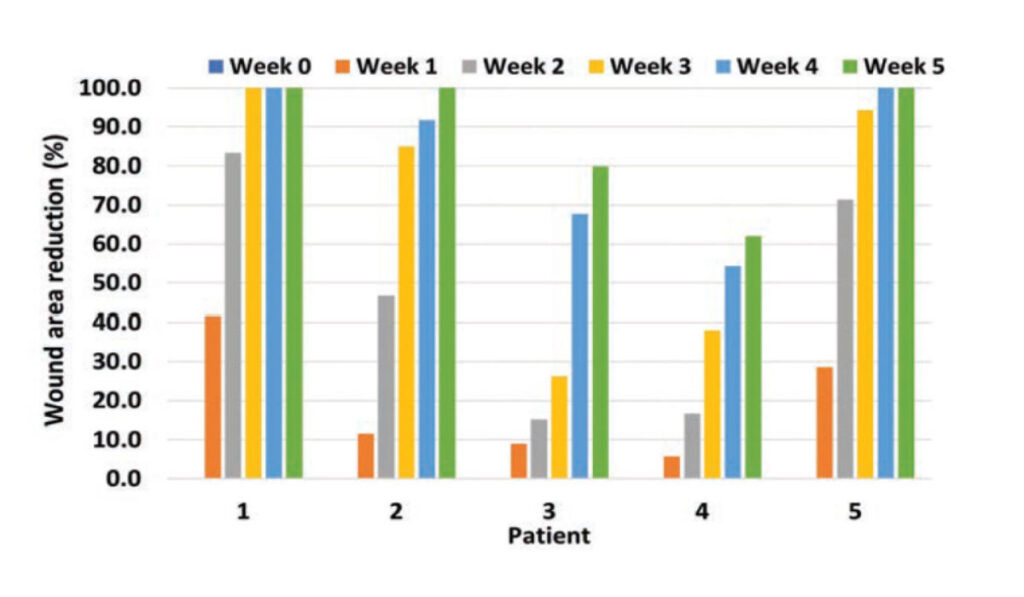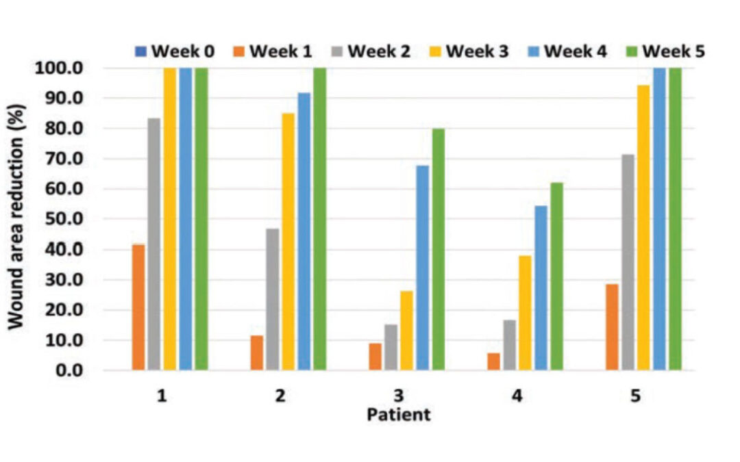 Figure 2. Percentage wound area reduction over the 5-233k observation period. Reprinted from Cole W, Woodmansey E. Monitoring the effect of continuous topical oxygen therapy with near-infrared spectroscopy: a pilot case series in wound healing. Wounds. 2024;36(5):154-159. doi: 10.25270/wnds/23150. © 2024 HMP Global. All rights reserved.