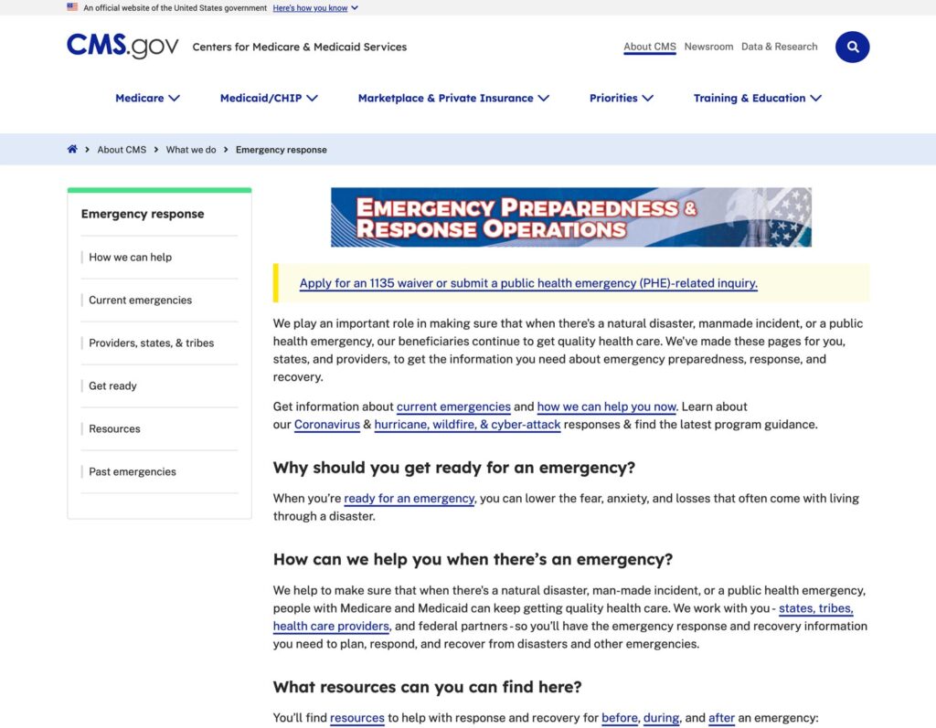 To prepare for current and future disasters, CMS has developed an inventory of Medicaid and Children’s Health Insurance Program (CHIP) flexibilities and authorities available to states in the event of a disaster to support Medicaid and CHIP operations and ensure continuity of coverage for people served through Medicaid and CHIP programs during times of crisis. For more information and to access the inventory and toolkit, visit https://www.medicaid.gov/state-resource-center/disaster-response-toolkit/index.html