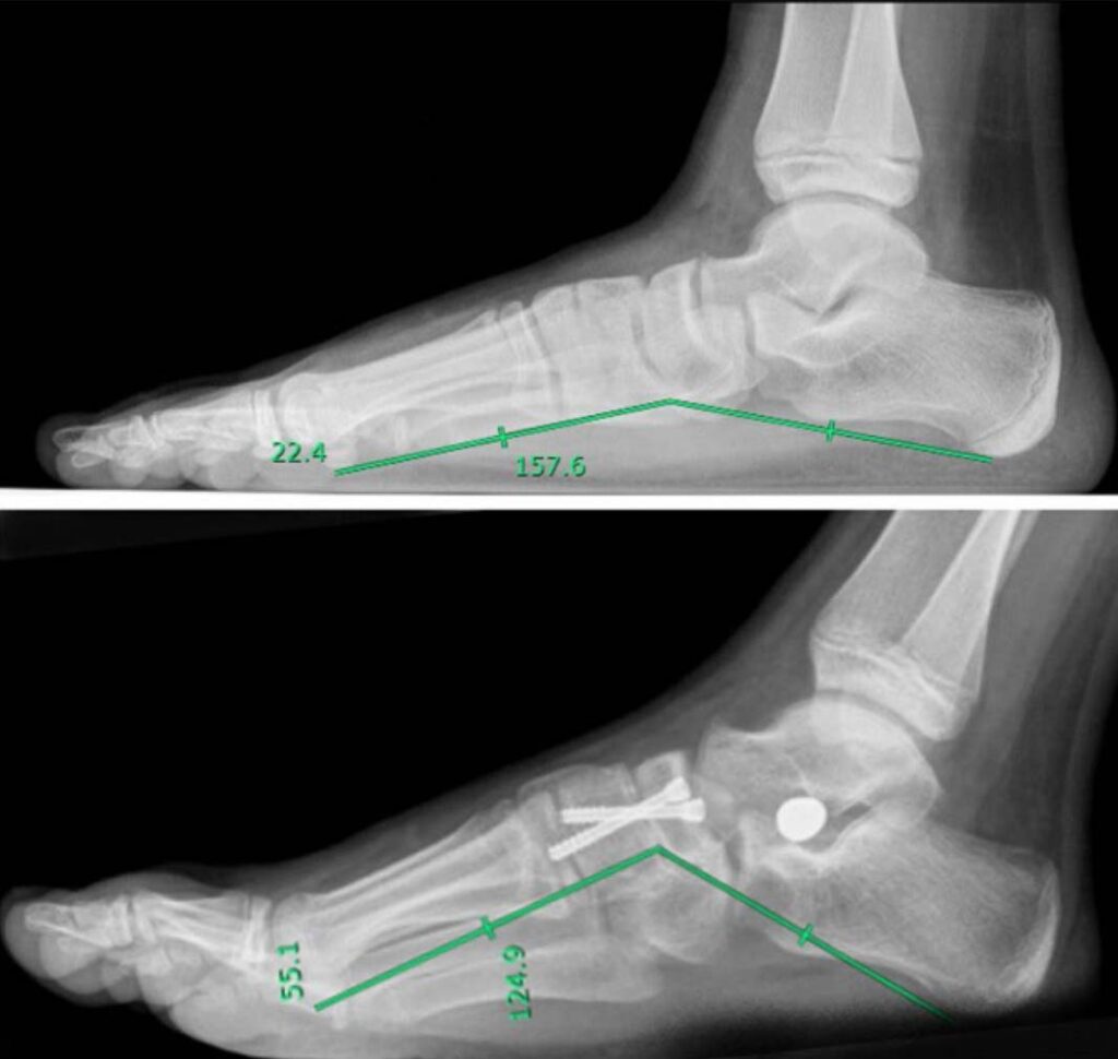 Figure. Evaluation of Costa-Bertani angle in a pre (top panel) and post (bottom panel) surgical x-ray in a right foot. The Costa-Bertani angle is a measurement used to evaluate the stability of the foot’s longitudinal arch. Inclusion criteria for surgery was Costa-Bertani angle >140 degrees.