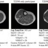 T1 cross-sectional images of the legs of a control, a patient with Type 2 diabetes (T2DM), and a Type 2 diabetes patient with peripheral neuropathy (T2DMPN). These images exemplify the progression of obesity (control) to T2DMPN and the accompanying loss of subcutaneous adipose tissue (SQAT), accumulation of leg intermuscular adipose tissue (IMAT), loss of muscle volume (gastroc-scoleus% vol.), and...