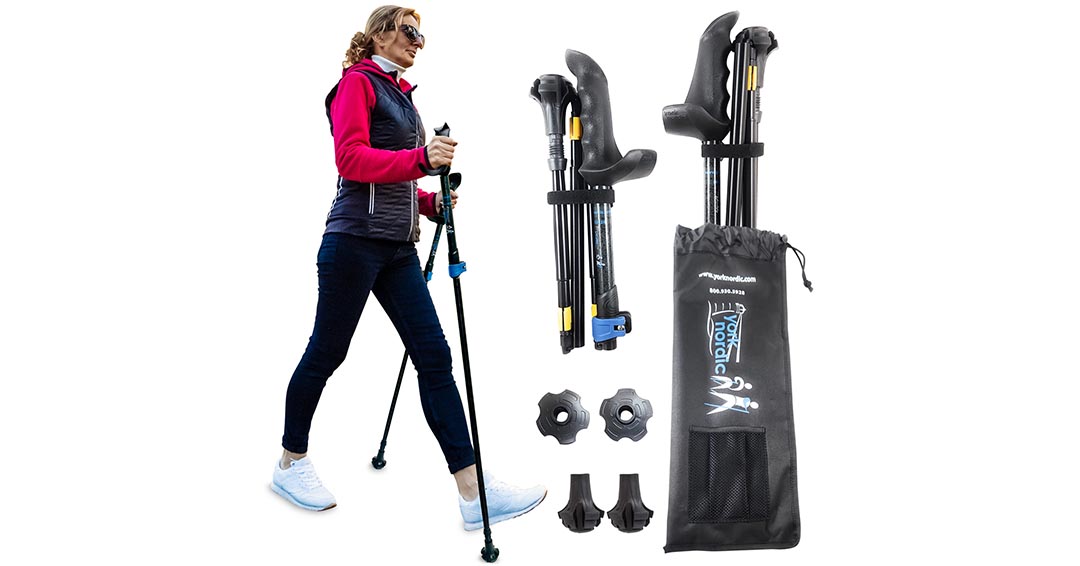 The Motivator Folding Travel Pole combines the innovative, patented ergonomic Motivator grip with the York Nordic’s renowned travel poles to ensure the ability to continue rehabilitation and walking routines while traveling or on the move. The Motivator Folding Travel Pole has been lauded by physical therapists for its use in the rehabilitation process due to the increased balance and stability patients find with the unique grip offering 2 thumb positions. The strapless grip design improves proprioception and offers state-of-the-art ergonomics and hand support for the biaxial saddle joint. The result is a 10 times reduction in stress at the carpometacarpal joint minimizing torsional load while providing balance and stability to the patient looking for motivation to begin walking more confidently. The travel poles fold up to 13.5”, so that they can easily be packed or stored during travel.