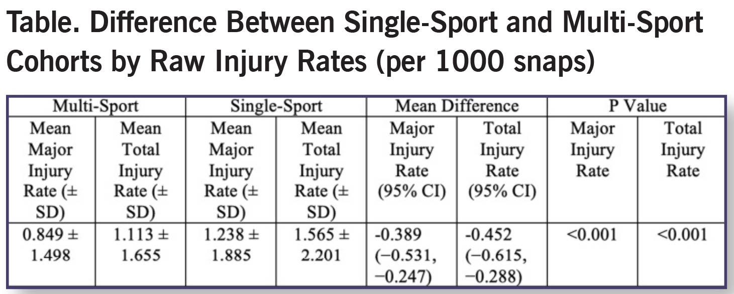 1,000 snaps, P <0.001) and major injuries (0.849 ± 1.498 vs. 1.238 ± 1.885, P <0.001) compared to their single-sport counterparts. Poisson regression was associated with a 20% reduction in total injury incidence (IRR 0.801, 95% CI 0.757–0.849, P <0.001) and a 23.5% reduction in major injury incidence (IRR 0.765, 95% CI 0.714–0.818, P <0.001) in multi-sport athletes. These differences were consistent across most position groups, excluding quarterback and offensive linemen. No significant difference was found between draft round and injury rate.
