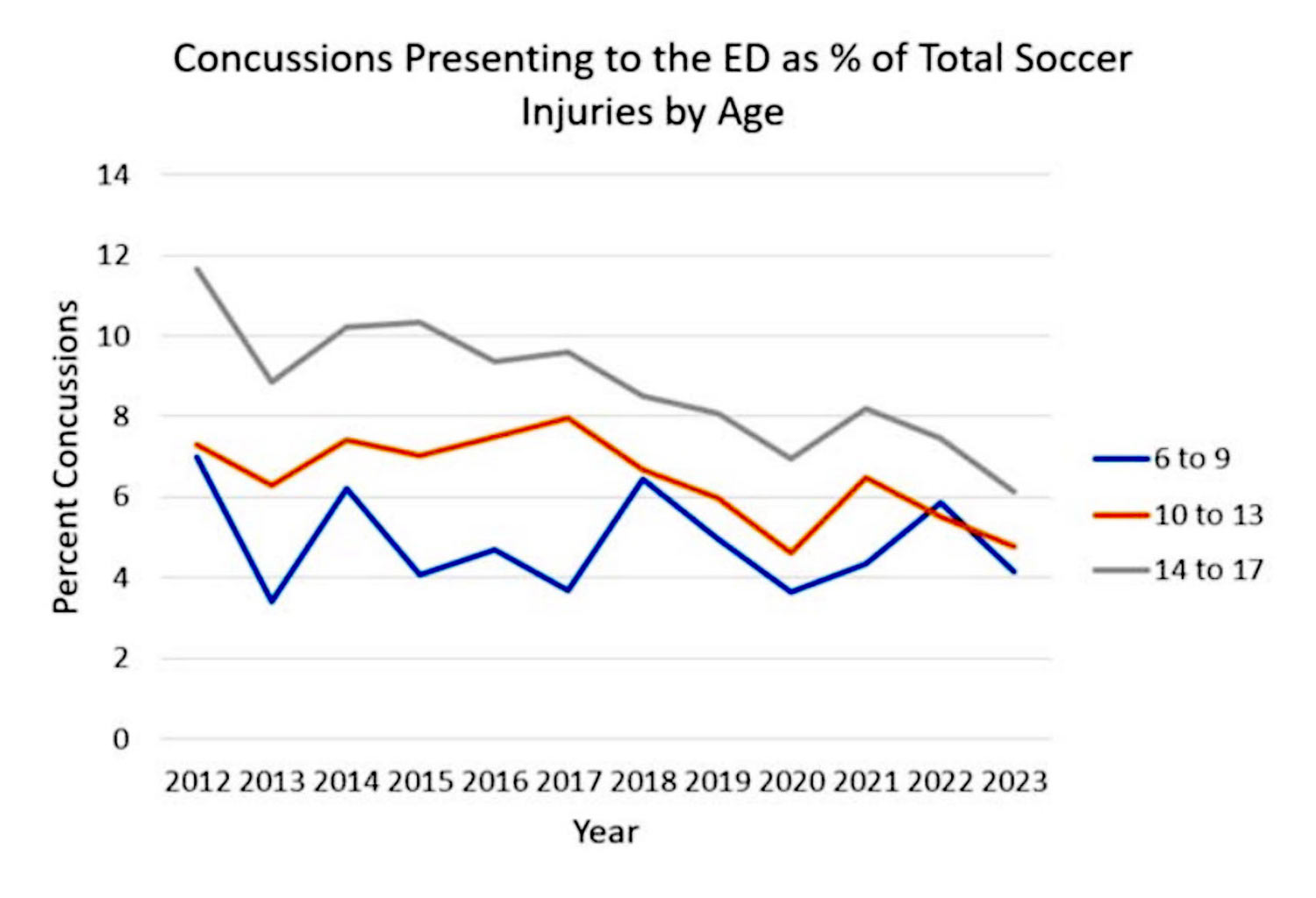 Sullivan GR, Lin E, Hoffer A , Richardson M, Chhabra A. Pediatric Concussion Injuries in Soccer: Emergency Department Trends in the United States from 2012 to 2023. Presented at 2025 Annual Meeting of the American Academy of Orthopaedic Surgeons. San Diego, CA: March 10-14, 2025.