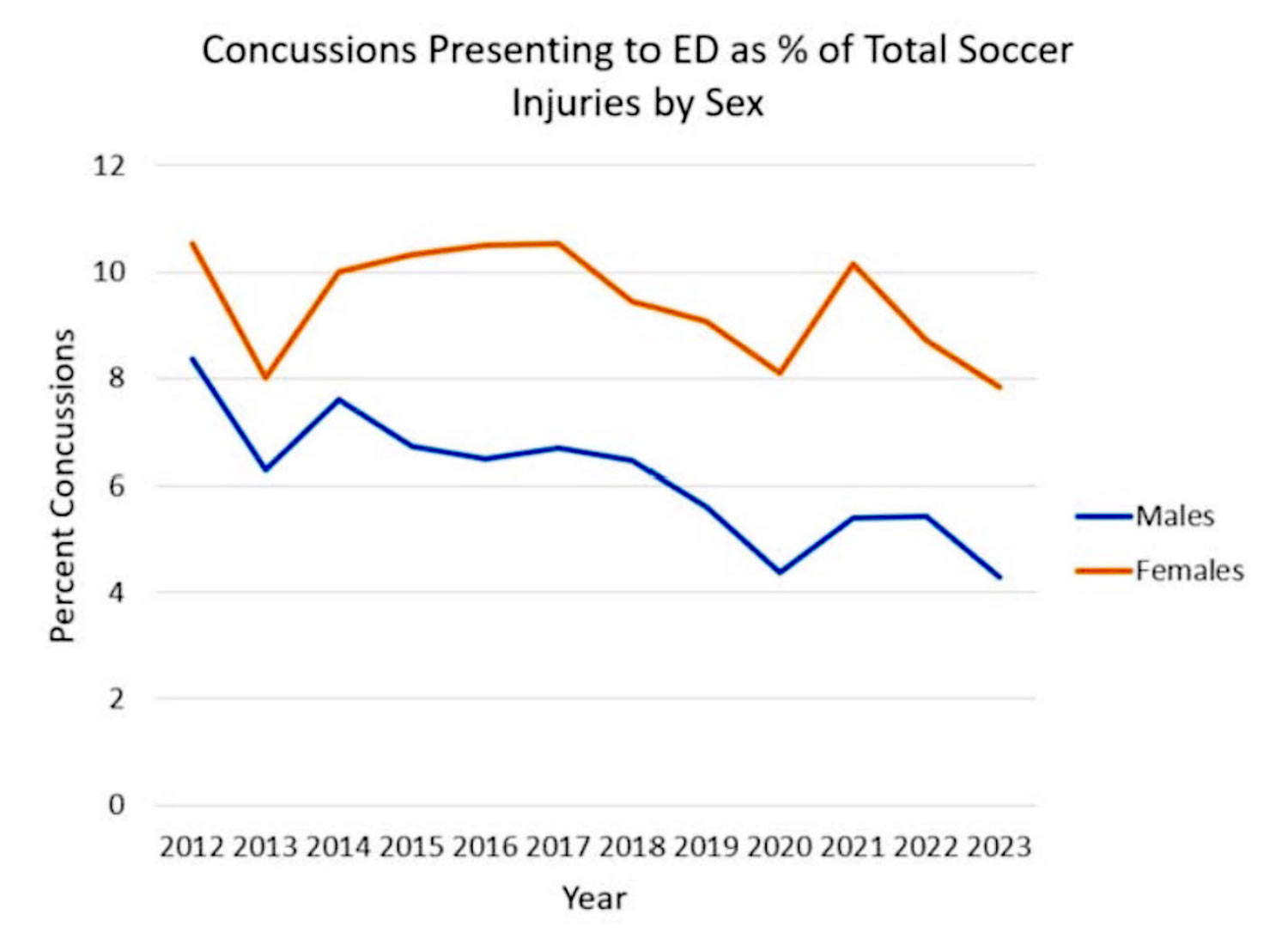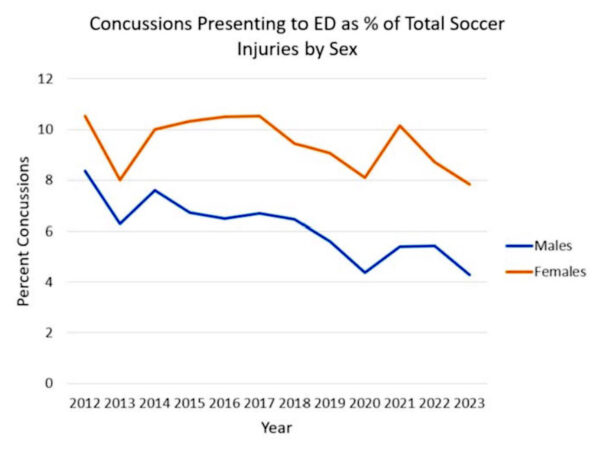 A retrospective cohort from the National Electronic Injury Surveillance System (NEISS) database was assessed. Age, sex, and injury type were extracted for all soccer-related emergency department visits between January 1st, 2012, and December 31st, 2023. Univariate and multivariable regression analyses were conducted to assess concussions as a percentage of all soccer-related injuries based on sex, age group, and year.