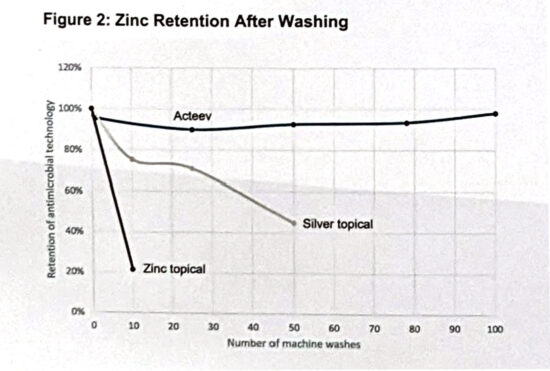 Different form factors were constructed for easy incorporation into compression devices or wound dressings. Unlike topical coated products, zinc retention analyses per inductively coupled Plasma Spectroscopy demonstrated that the embedded zinc ions remain in the polymer after >100 machine wash cycles per AATCC protocol (Fig 2).