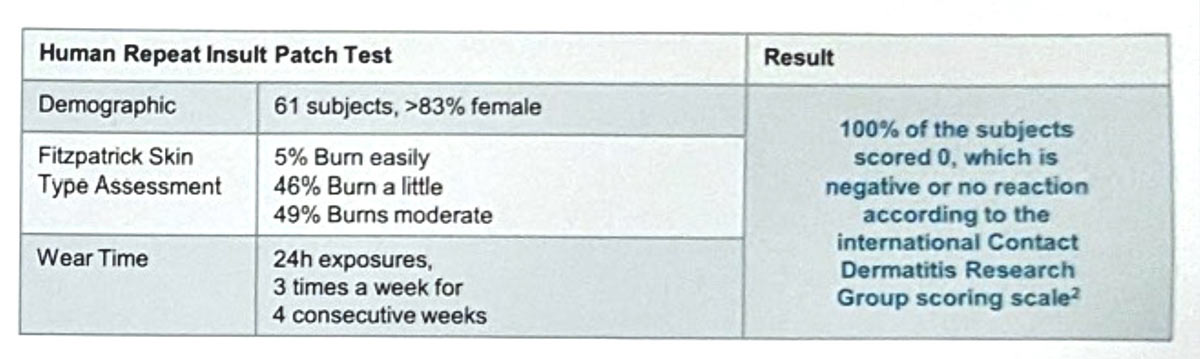 Skin Testing: Material A, B, and knitted fabric with 8% spandex (Material C) show non-cytotoxicity during MEM elution test using L929 cells. The same materials were utilized in a Human Repeat Insult Patch Test to evaluate skin irritation: 100% of the subjects showed no reaction according to the International Contact Dermatitis Research Scoring Group scale (Fig 3).