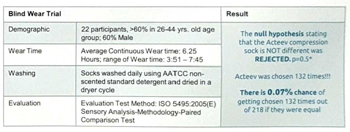 Wear Trial: A compression sock with zinc ion embedded texturized nylon 6.6 yar was constructed and confirmed antibacterial efficacy. In the same facility, they constructed a sock with their current yarn. The null hypothesis stating that the Acteev compression sock is not different was rejected (P=0.5) (Fig 4).